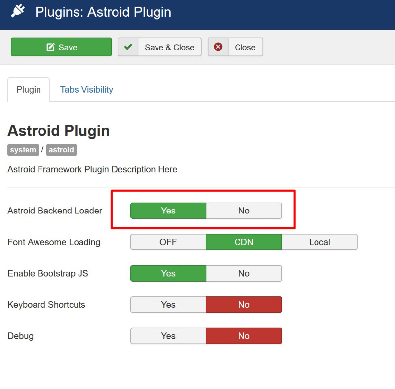 1.) Joomla Extensions Plugin > Astroid Plugin > Backend Loader = YES