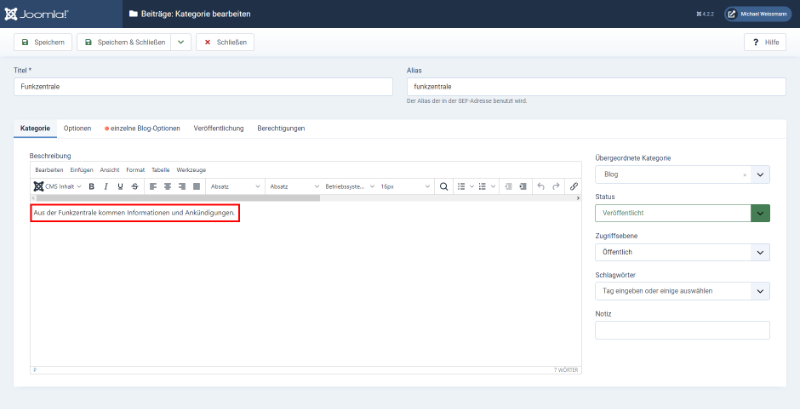 Sofern der Menupunkt zu den Kategorien auch richtig konfiguriert ist zeigt das System die Beschreibung an.
