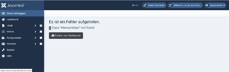 Wenn ich im Backend das off-canvas-Mainmenu aufrufen möchte, bekomme ich bei allen Menüpunkten die Meldung aus dem Angang (menushelper.jpg).