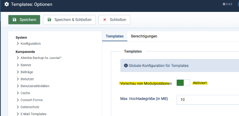 Danach zurück aus System und Site Templates aufrufen. Nun erscheint unter der Templatebeschreibung ein Text Vorschau. Den anklicken und Sie sehen nun die ganzen Positionen.