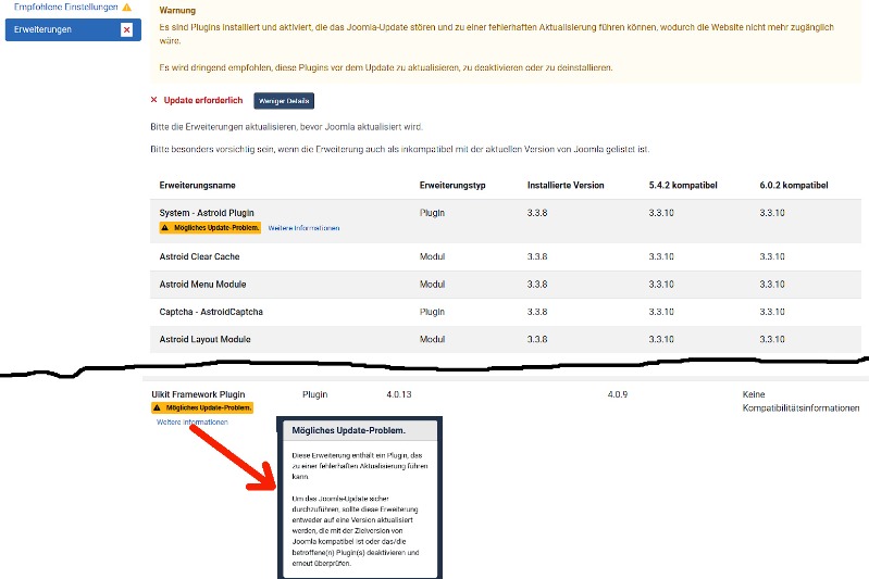 Bei der Installationsprüfung wird angezeigt, dass das System - Astroid Plugin erst ab Version 3.3.10 J6-kompatibel sei (übrigens auch bei J5.4.2), aber die aktuelle Version 3.3.8 ist. Es gibt aber kein neueres als 3.3.8.