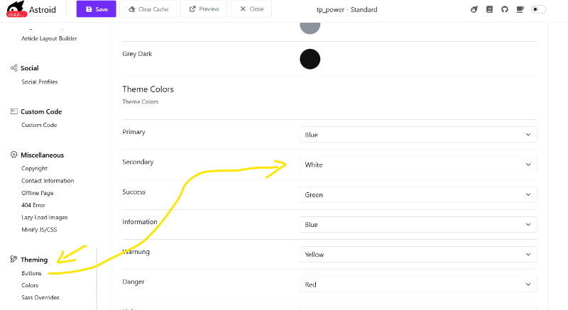 Gehen Sie in die Template-Optionen und stellen Sie bei Astroid unter Color Button die Farbe um. Steht bei Ihnen bestimmt in Secondary auf weiß.