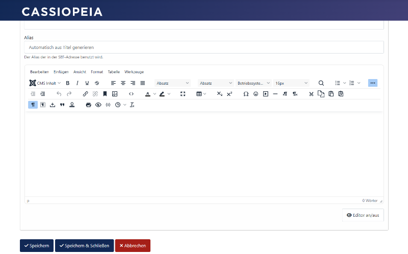 Im Frontend-Editor sind die Schaltflächen unsichtbar. Je nach dem, welchen Editor ich verwende, sollten dort eine (TinyMCE) oder mehr (JCE) Buttons zu sehen sein. Bei Cassiopeia ist alles ok.