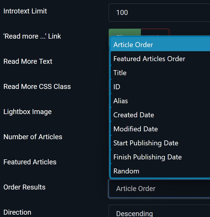 Konkret habe ich im Field "Ordering" die Zeile 107 komplett neu eingeführt (die Option "a.title", allerdings hier ohne Sprachschlüssel) und das Show.On im Field "Direction" (Zeile 115) entsprechend ergänzt (Beispiel siehe Anhang).