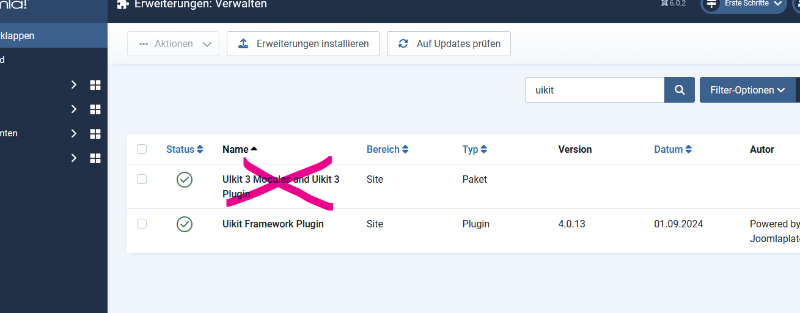 Laut Ihrem Post ( www.joomlaplates.com/forum/joomla-5-temp...ting-uikit3-php.html ) müssen nur Einträge in #_extensions oder #_plugins gelöscht werden. In #_plugins wird jedoch kein Eintrag gefunden..?!?
