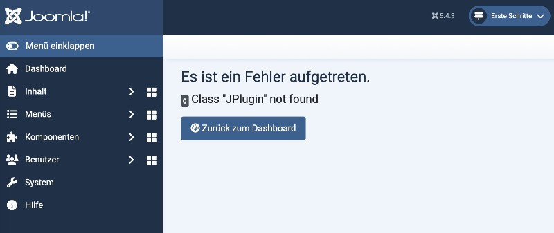 Nach deaktivieren des Abwärtskompatibilitätsplugins erscheint der Fehler wieder: Das Frontend läuft, das Backend ist blockiert mit dem Fehler: "Es ist ein Fehler aufgetreten. 0 Class "JPlugin" not found"